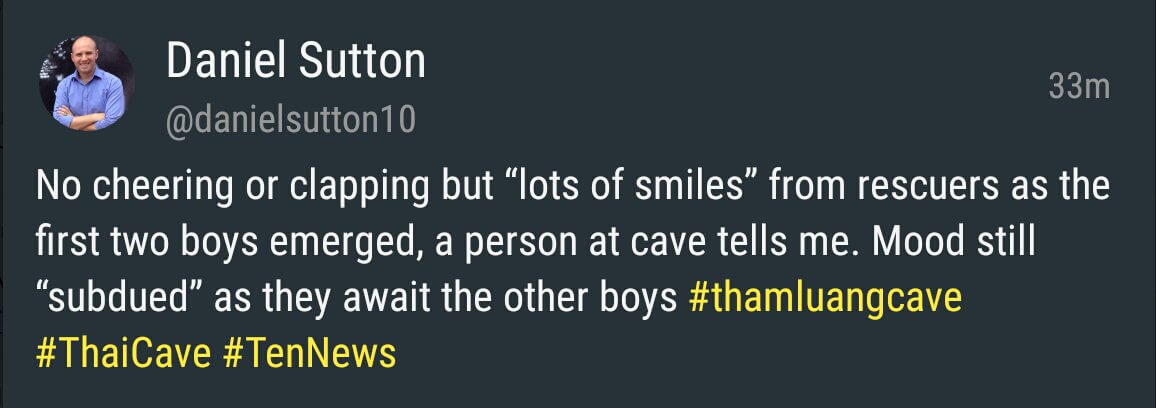 «Никто не радуется и не хлопает, но спасатели улыбались, когда появились двое мальчиков, рассказал мне человек из пещеры. Настроение пока напряженное, потому что ждут остальных».